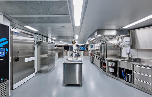 Im Erdgeschoss befindet sich die zentrale Produktionsküche als Herzstück der gastronomischen Infrastruktur. Sie versorgt sämtliche Bereiche der Arena. Modernste Küchentechnik ist in eine kompakte und effiziente Raumstruktur integriert, die optimale Arbeitsabläufe ermöglicht und sämtliche Bereiche koordiniert und gesteuert.