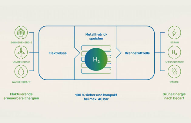 Das System Triewald, entwickelt von eRevo und GKN, ist ein innovatives Energiespeichersystem, das auf der Erzeugung und Speicherung von grünem Wasserstoff basiert und direkt in das Gebäude integriert wird.