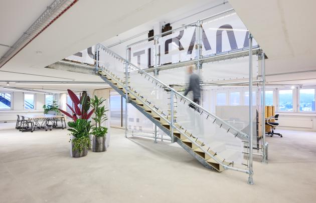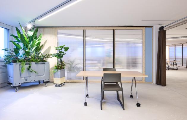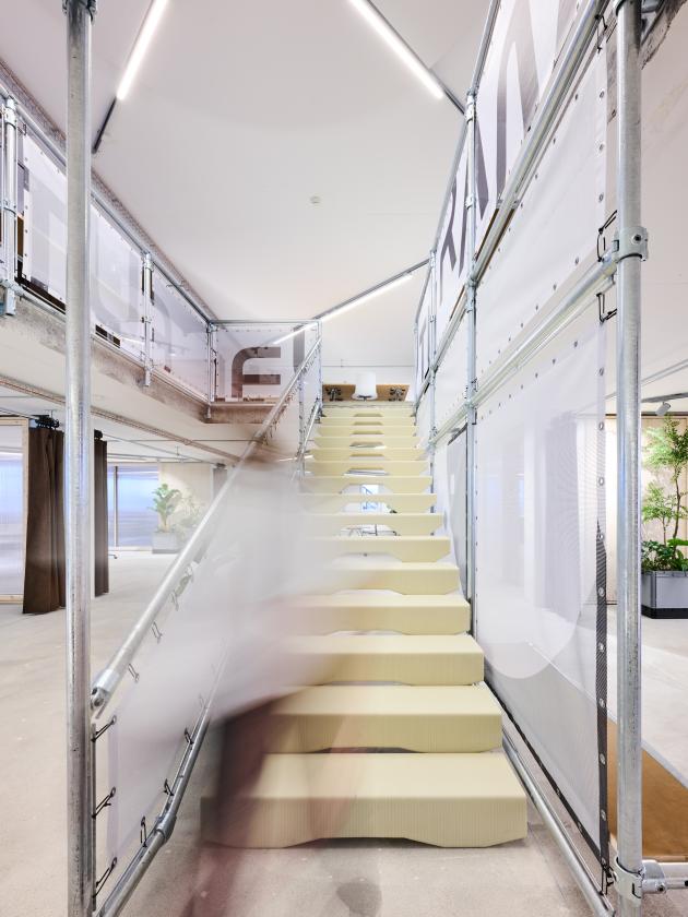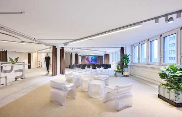 A particular innovation is the 3D-printed staircase, mounted on a modular structural framework. Several items of furniture, floor lamps and planters in the breakout zones were also produced using 3D printing. The plastic material can be granulated after use and reprocessed across multiple print cycles.