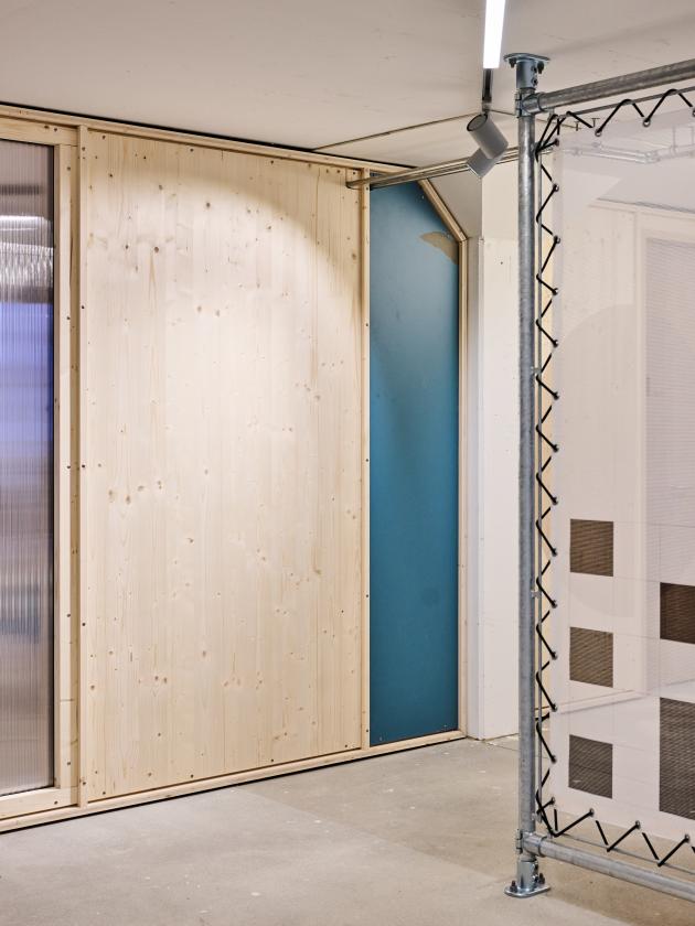 The construction relies on joining, interlocking and mechanical connections rather than adhesive bonding and plastering. Floor finishes are used only where necessary and are fixed rather than fully adhered. Lighting is installed via minimally equipped track systems, ensuring maximum adaptability.